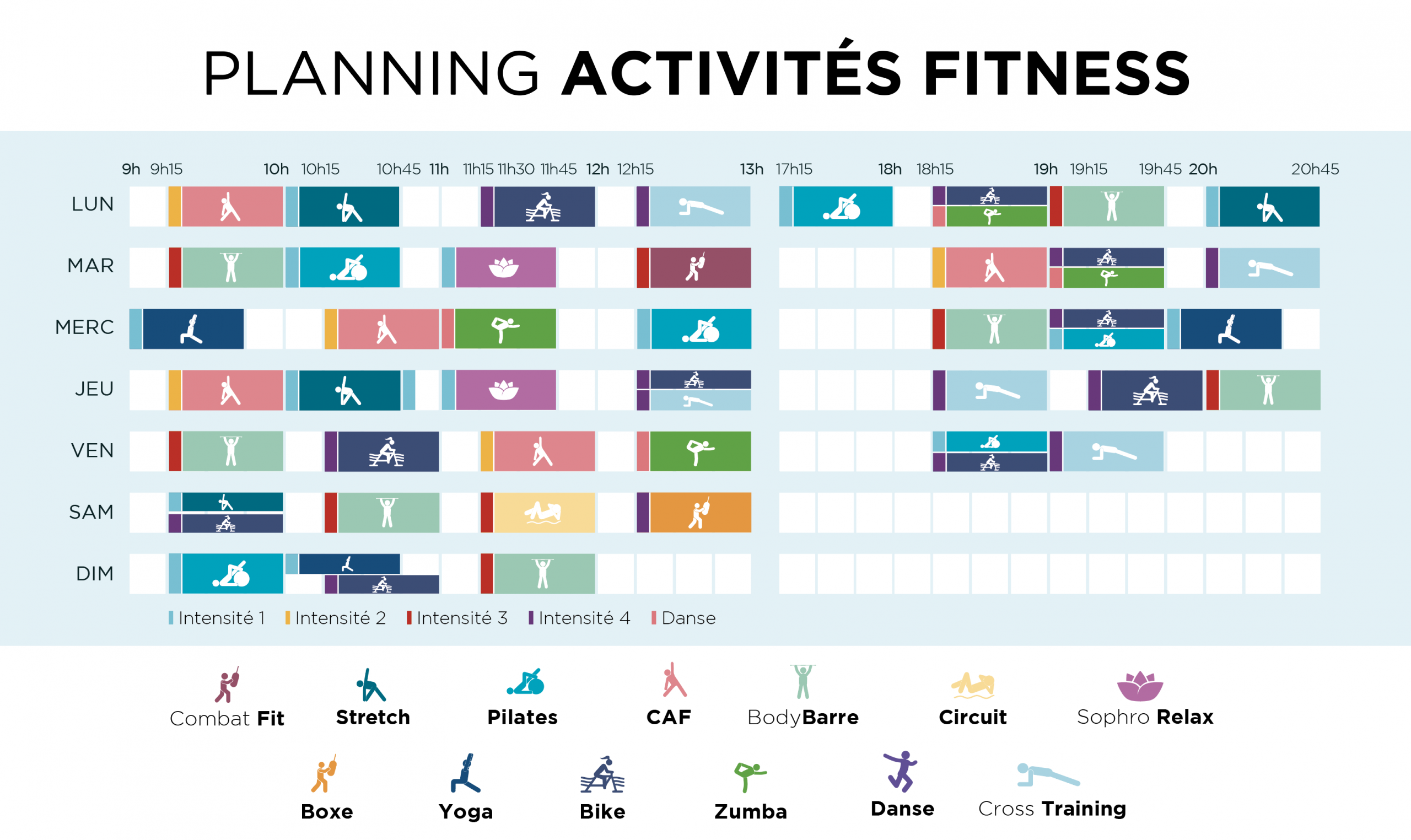 PLANNING FITNESS ACTIVITÉS FITNESS YOGA PILATES ZUMBA BODY BARRE BOXE STRETCHING BIKE CARDIO HIIT CAF MIX CARDIO CIRCUIT TOTAL RENFO